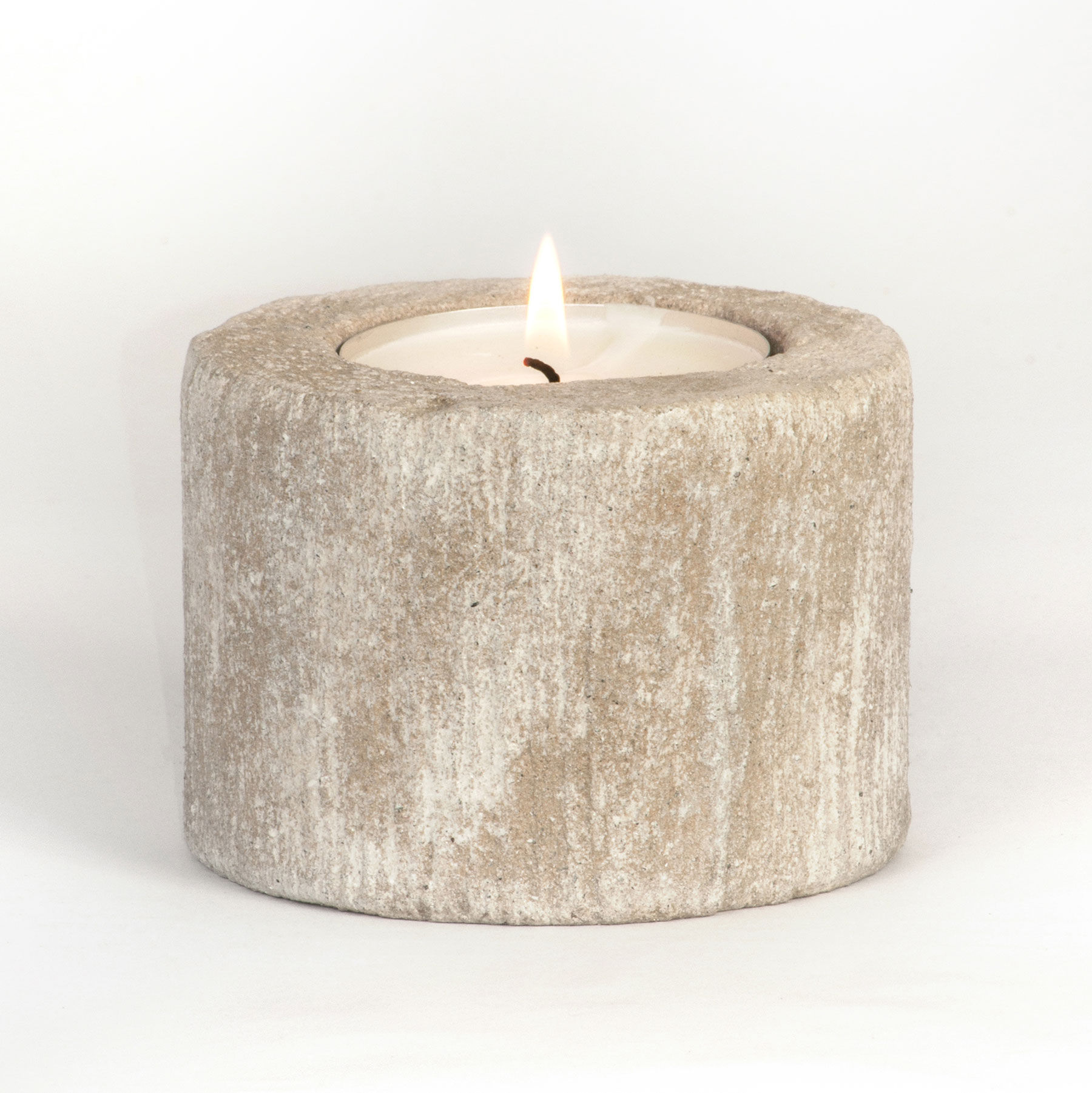 Candeliere a vaschetta circolare da tavolo e da terra per interni ed esterni in cemento invecchiato di colore grigio bianco. Accessori: 1 lumino.