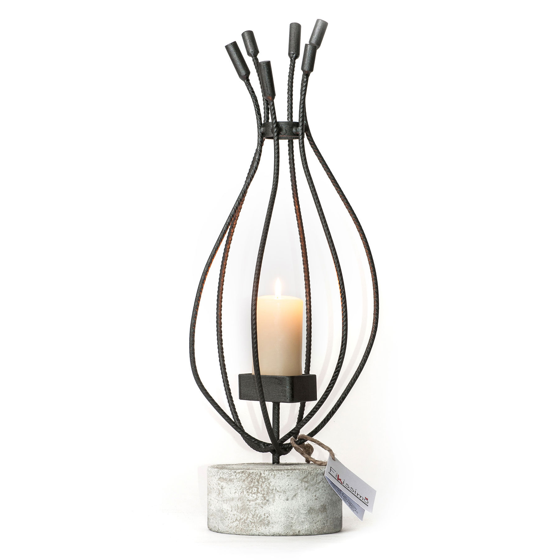 Questo oggetto di design della serie ATMOSPHERE, conquista per l’artigianalità del tondino in ferro assemblato con cura e per le finiture grezze, che contrastano piacevolmente con le forme sobrie, pure e pulite della candela bianca.