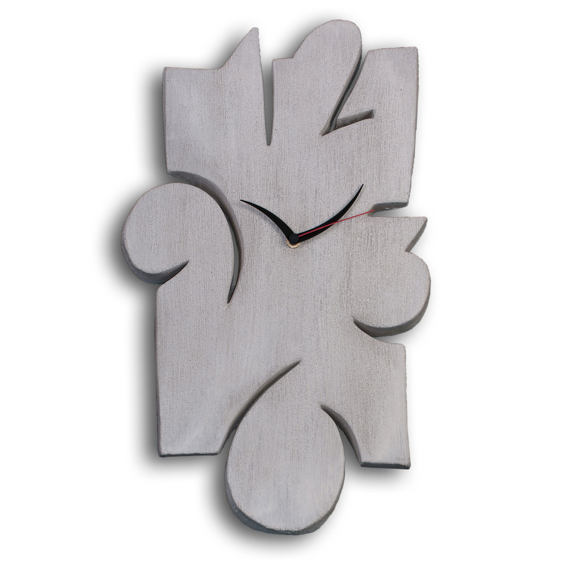 Orologio da parete Virgola, modello adatto anche per esterni, realizzato con cemento invecchiato di colore grigio bianco.