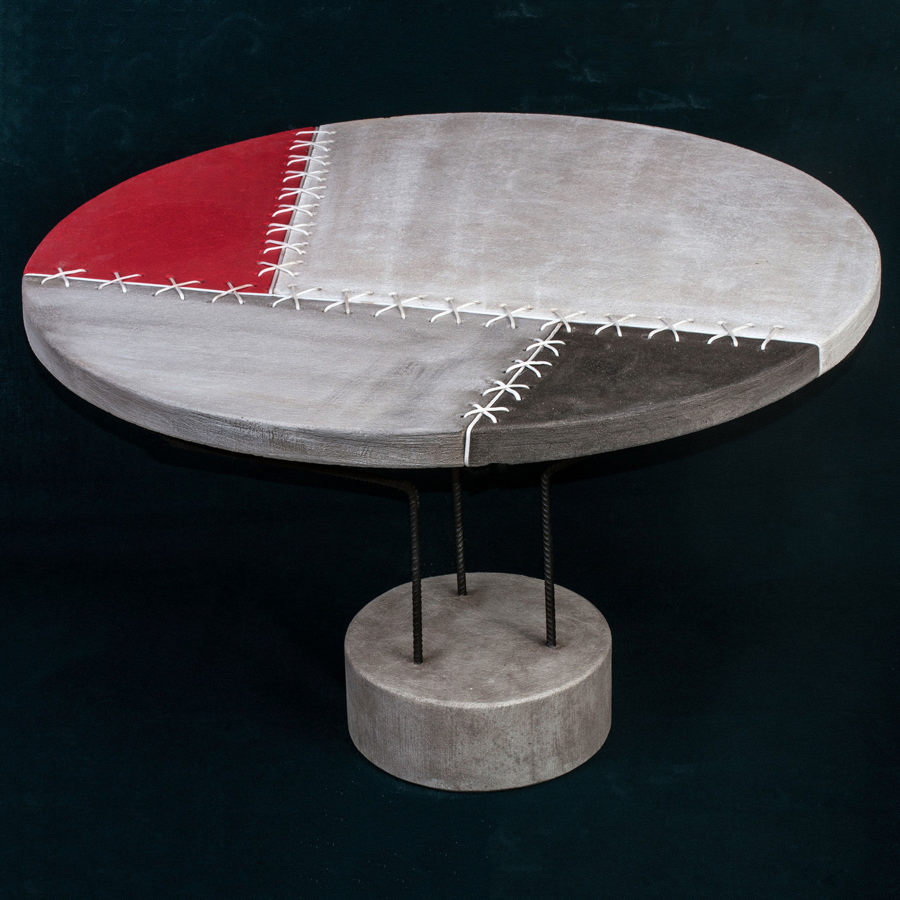 Tavolino circolare realizzato con piano in cemento colorato con inserti in corda sintetica sostenuta da tondini di ferro ad aderenza migliorata annegati in un basamento in cemento invecchiato colore grigio bianco.