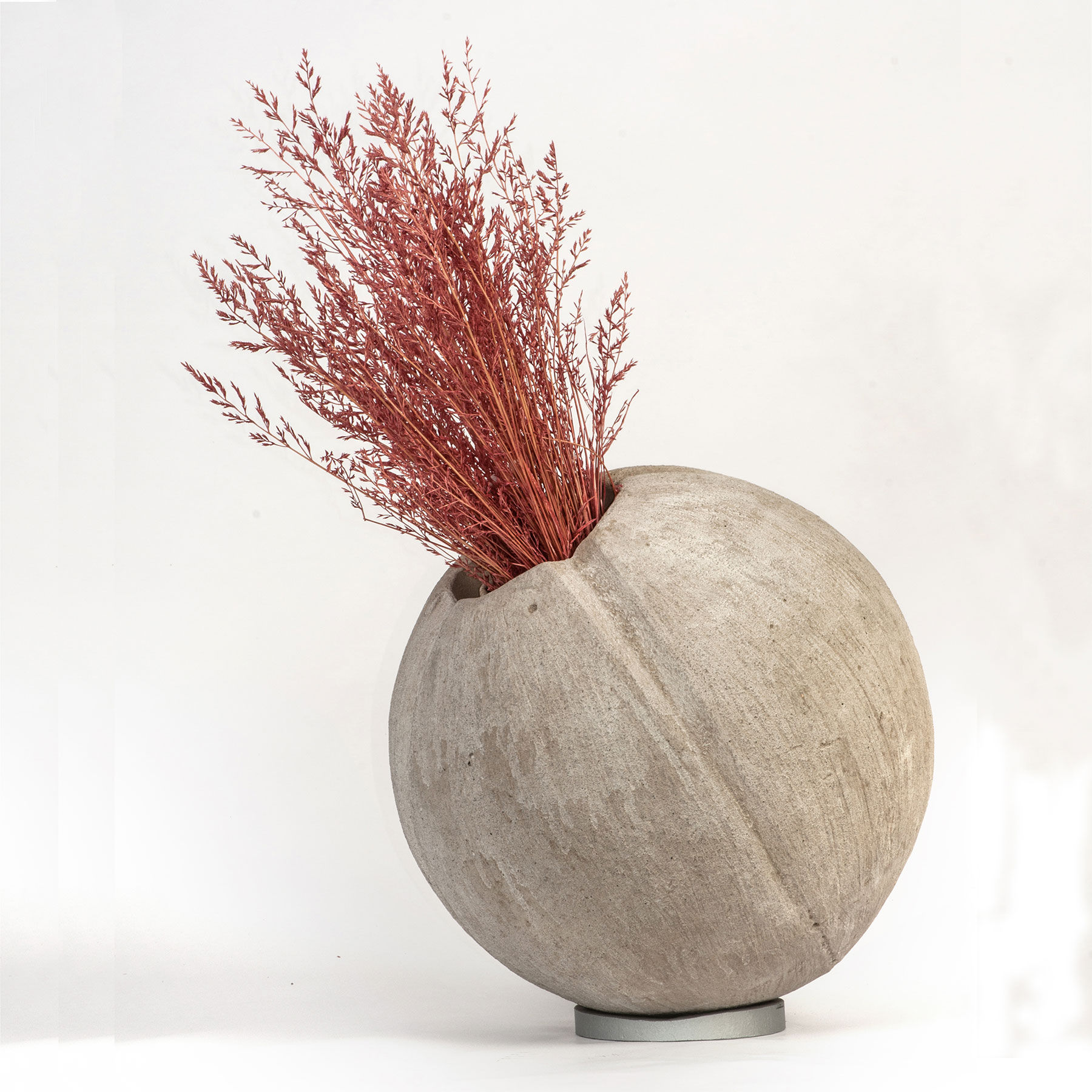 Vaso sferico realizzato in cemento graffiato invecchiato di colore grigio bianco con una base in ferro circolare verniciato per regolarne la posizione.